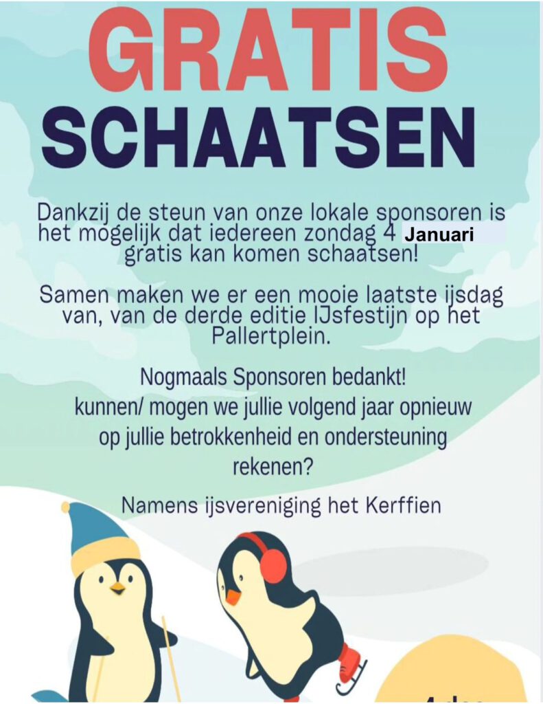 Vandaag, zondag 4 januari, is de laatste dag van het IJsfestijn. En met dank aan alle sponsors kan er GRATIS geschaatst worden.